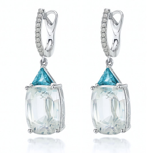 14K 20.80cttw Cushion White Zircon 1.08cttw Trilliant Blue Zircon 0.17cttw White Diamonds Drop Earrings