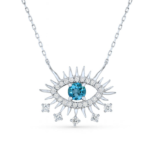 14K 0.68ct Round Blue Zircon 0.31cttw VS White Diamonds Evil Eye Necklace