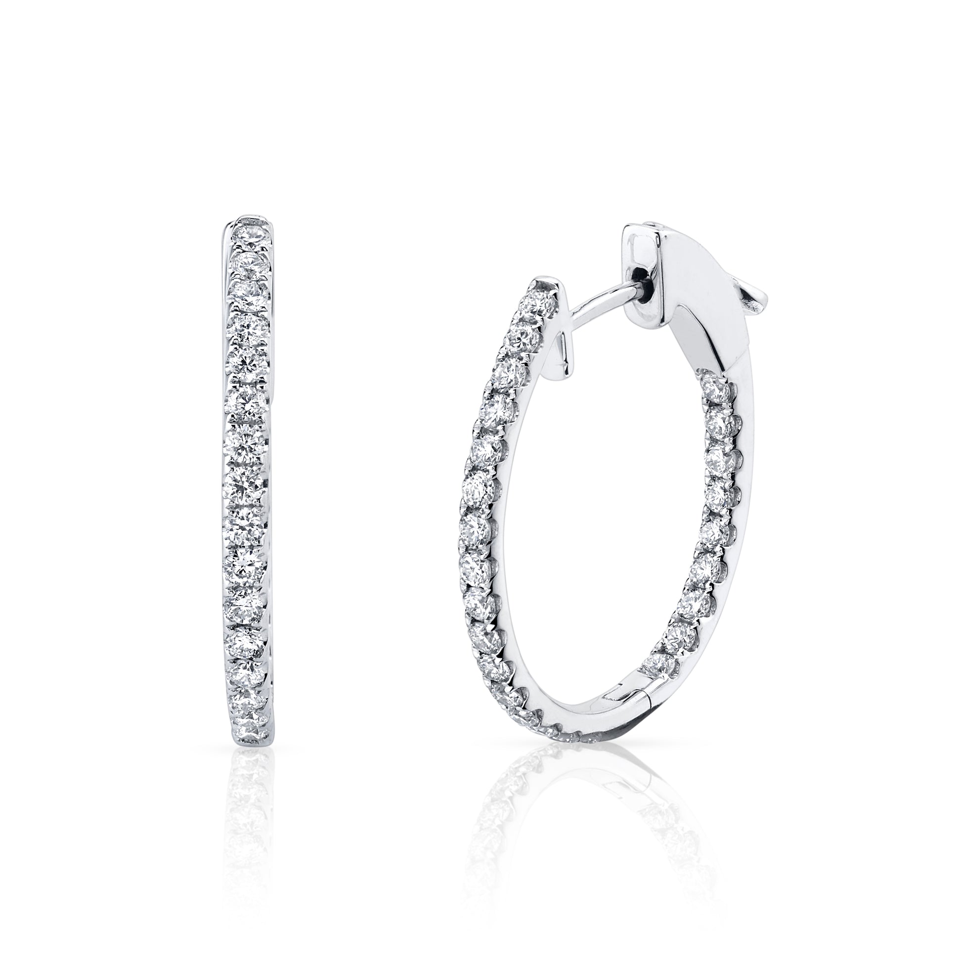 - 1.05 carats of natural round brilliant VS white diamonds set into solid 14K gold in a 1 inch oval inside out hoop earring