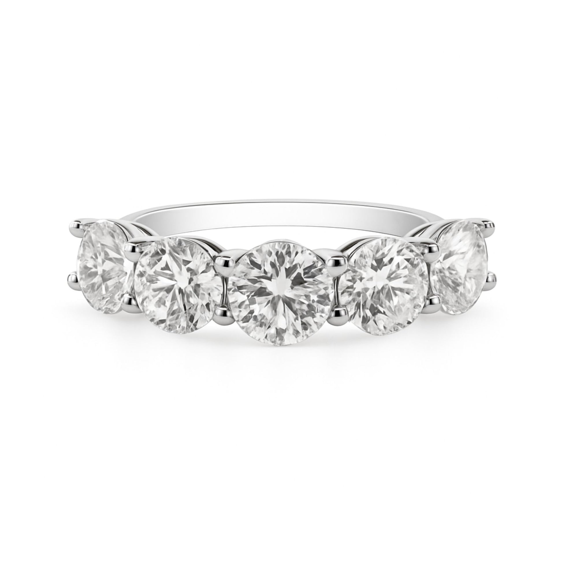 The Classics, Elevated. The eternally beautiful five stone band ring maximally elevated in quality and glamour with 3.50 carats of VS clarity natural white diamonds prong set into solid 14K gold.
