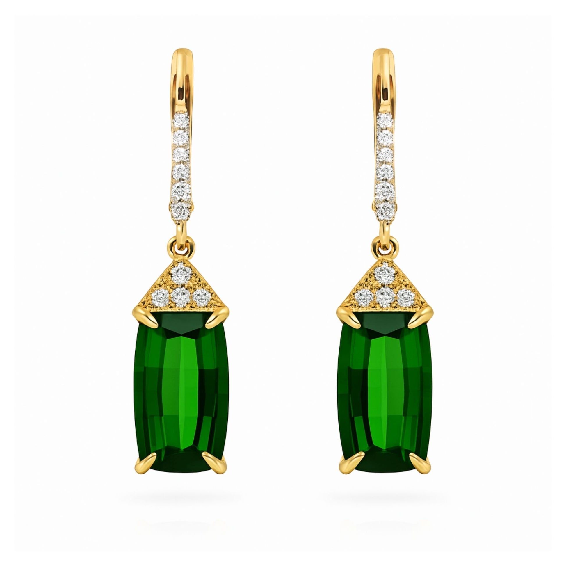 14K 7.83cttw Cushion Green Tourmaline 0.20cttw VS White Diamonds Drop Earrings