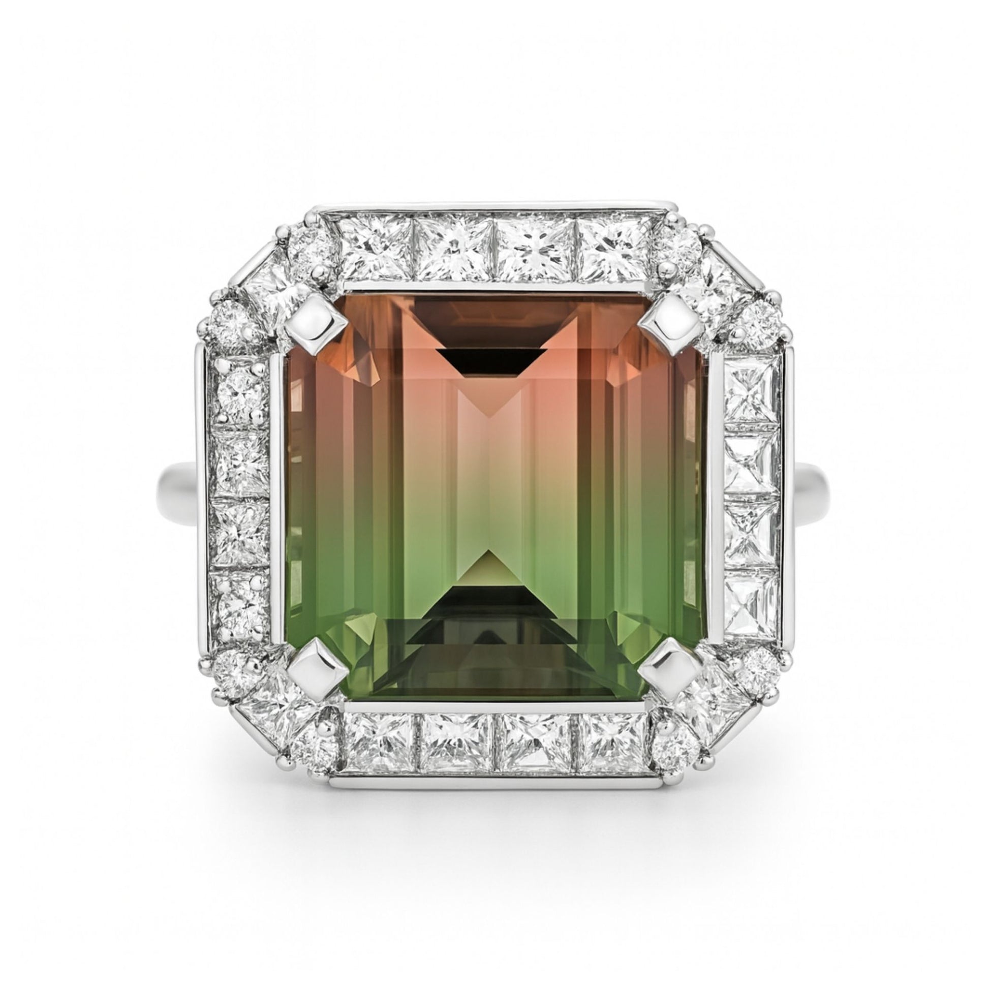 14K 8.21ct Emerald Cut Bi-Color Tourmaline 1.26cttw VS White Diamonds Ring