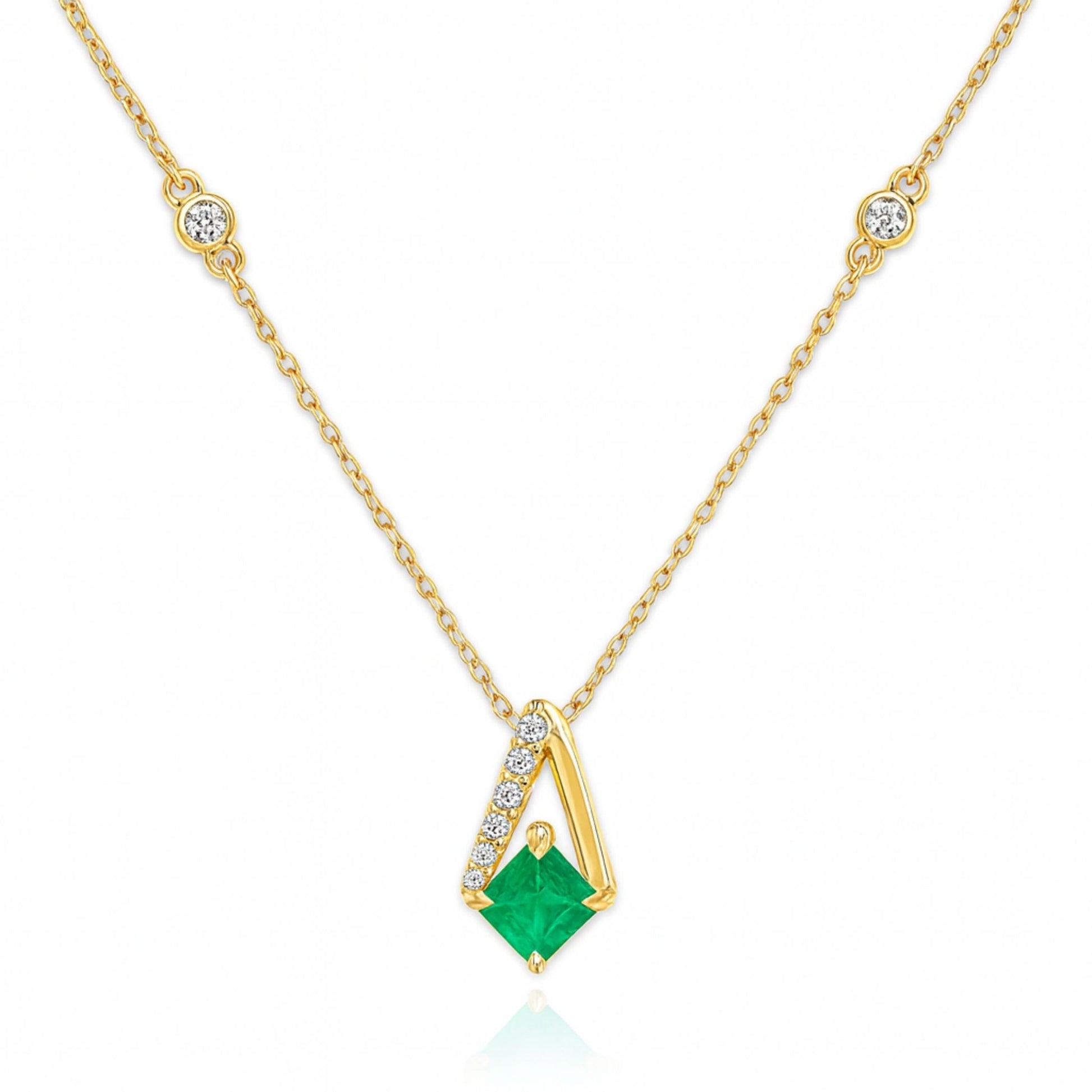 14K 0.15ct Asscher Cut Colombian Emerald 0.06cttw VS White Diamonds Necklace