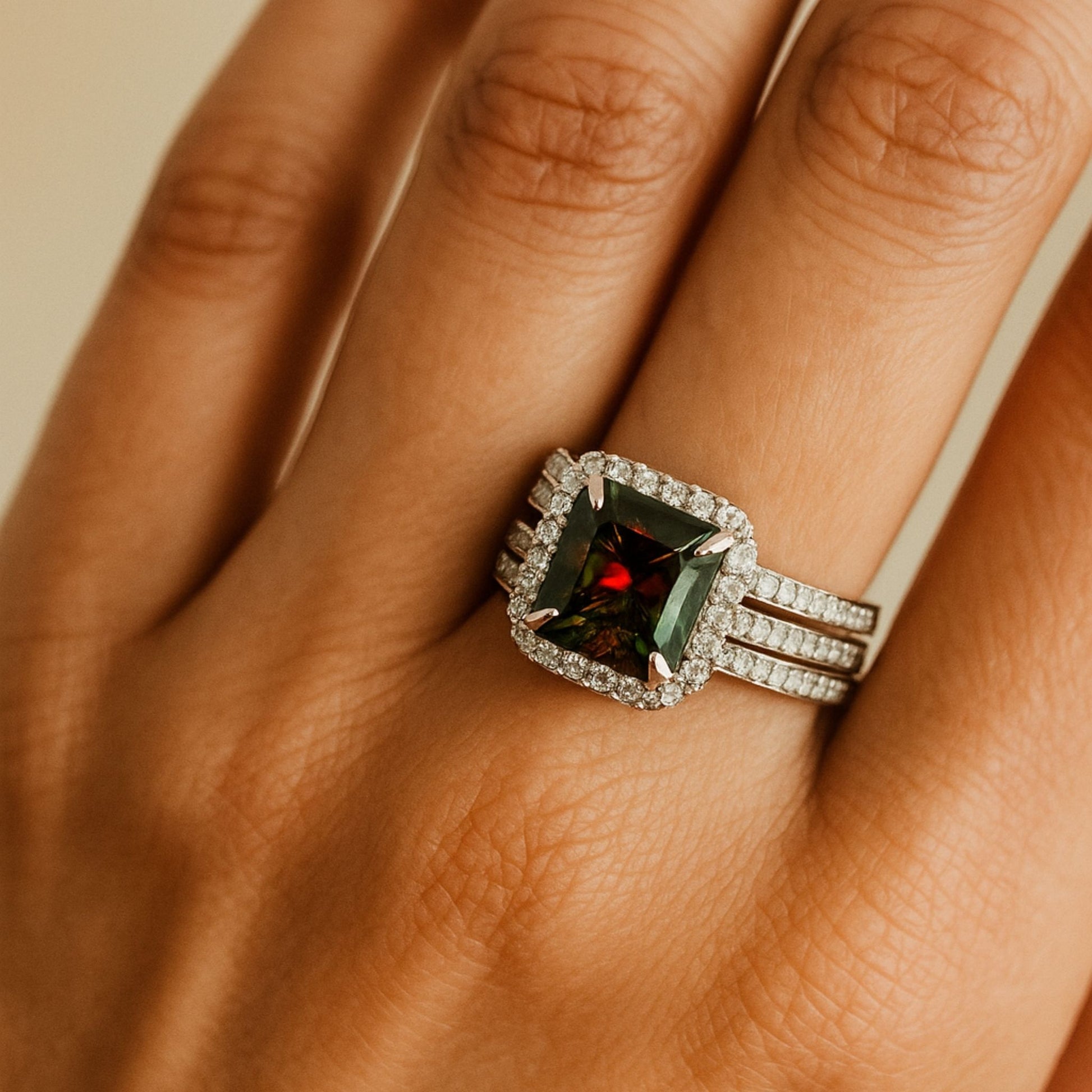 14K 4.16ct Asscher Cut Color Change Sphene 0.91cttw VS White Diamonds Ring