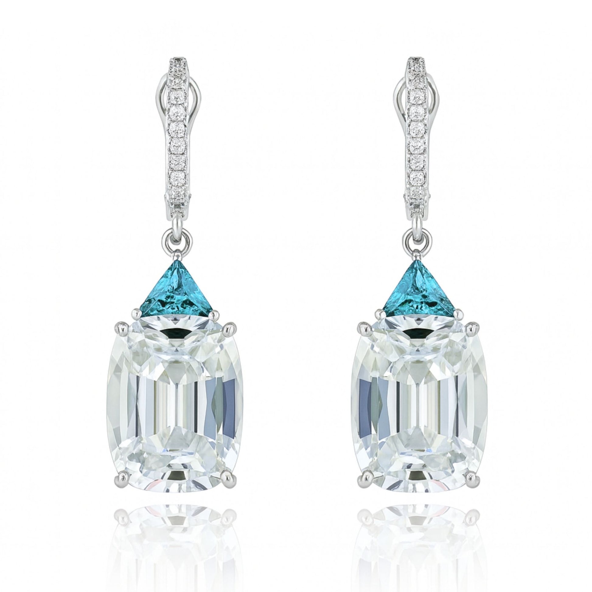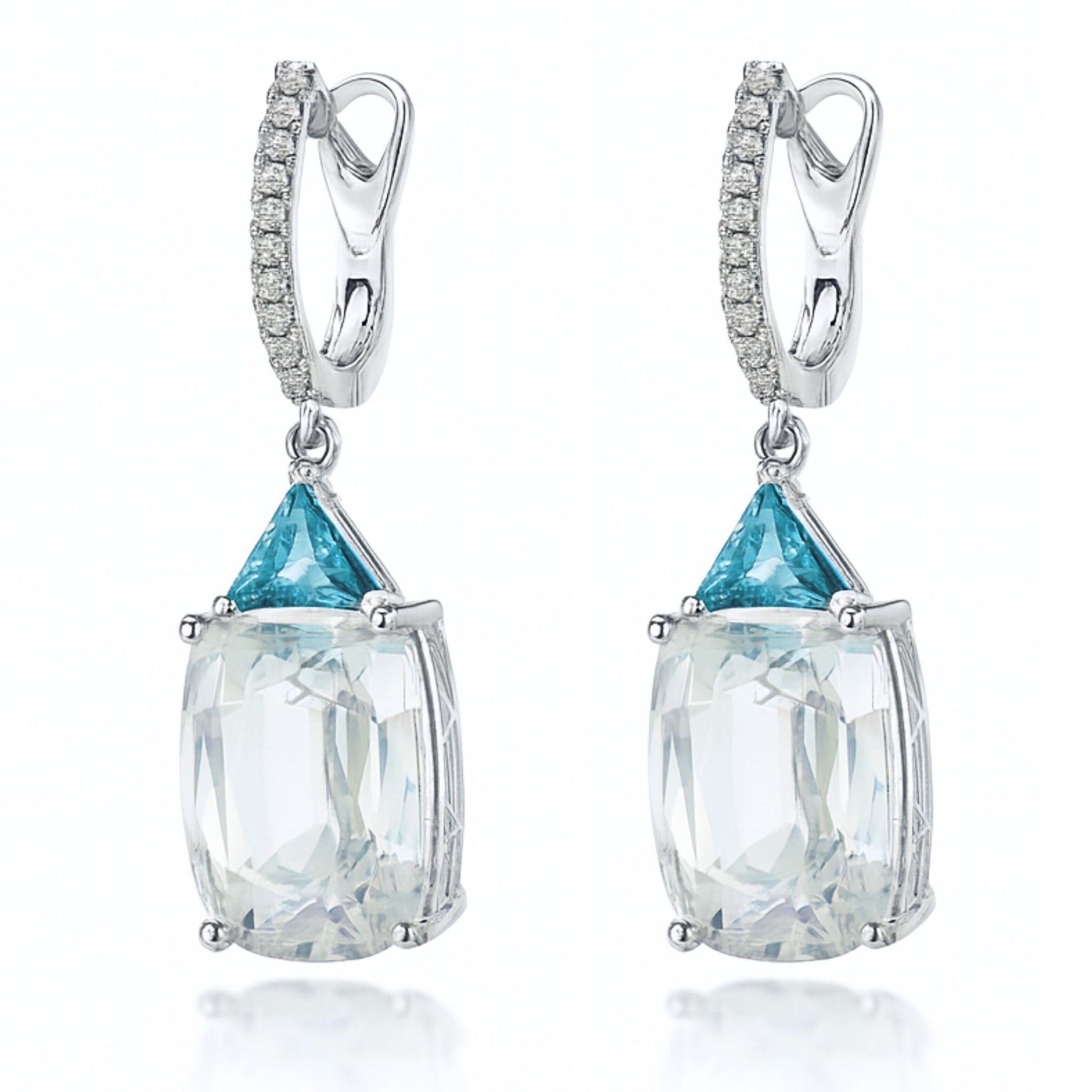 14K 20.80cttw Cushion White Zircon 1.08cttw Trilliant Blue Zircon 0.17cttw White Diamonds Drop Earrings