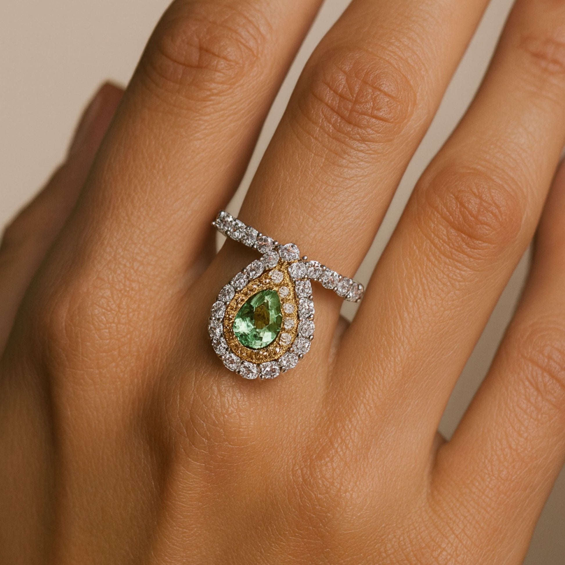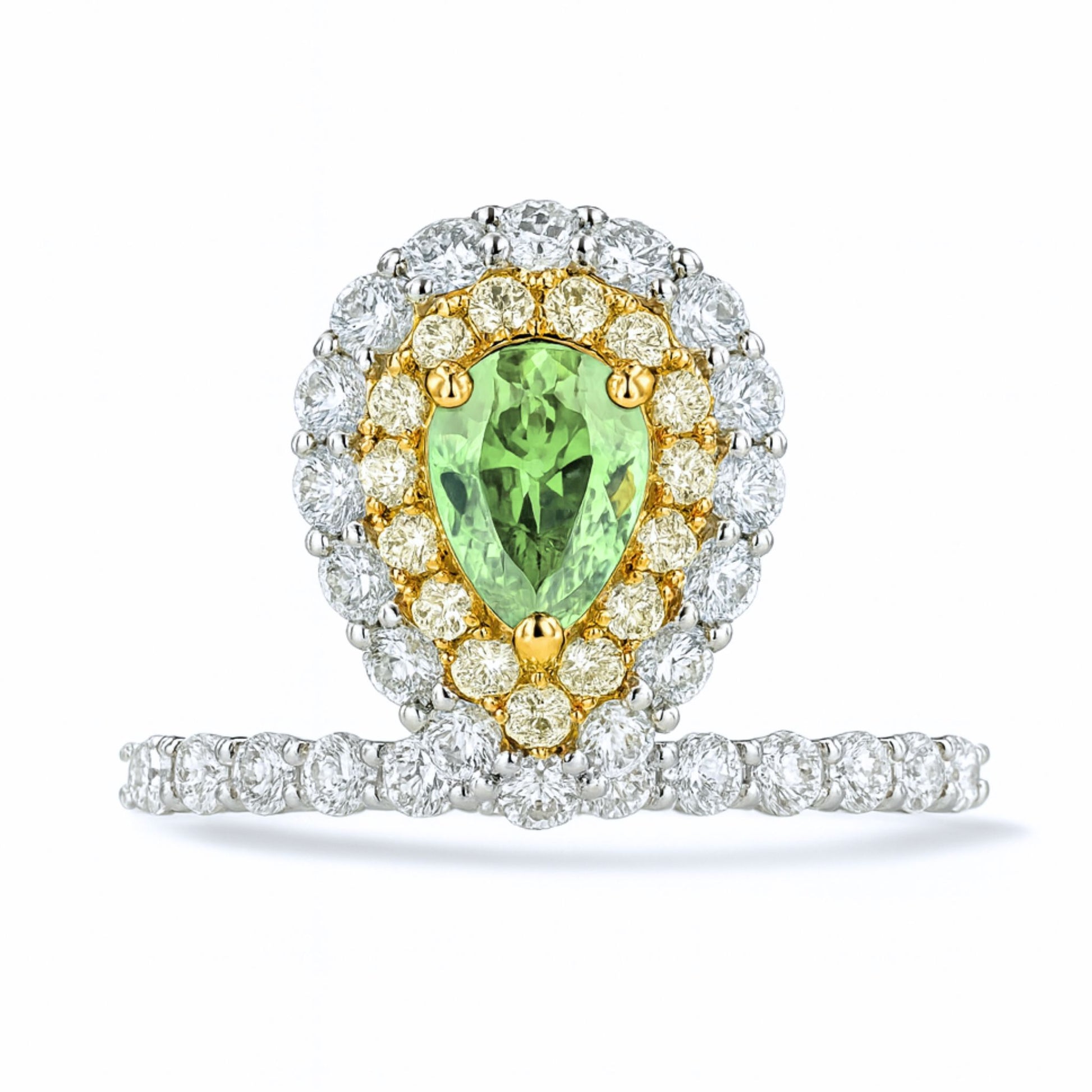 14K 0.90ct Pear Shape Green Kornerupine 1.69cttw VS Yellow & White Diamonds Ring