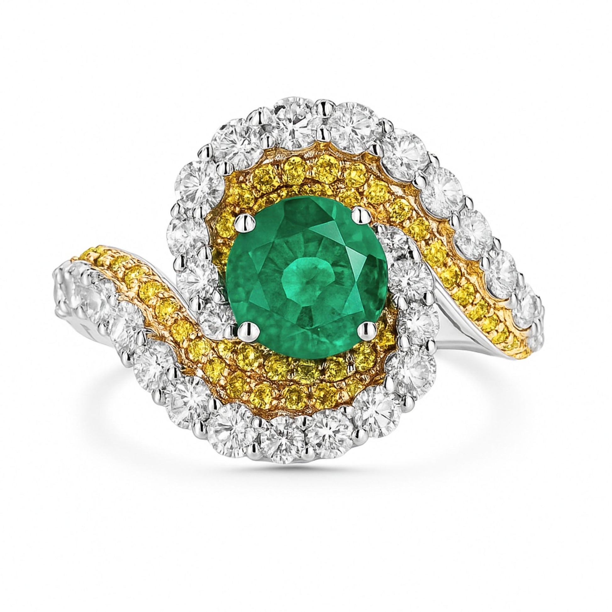 14K 1.00ct Round Colombian Emerald 1.63cttw Yellow & White Diamonds Ring