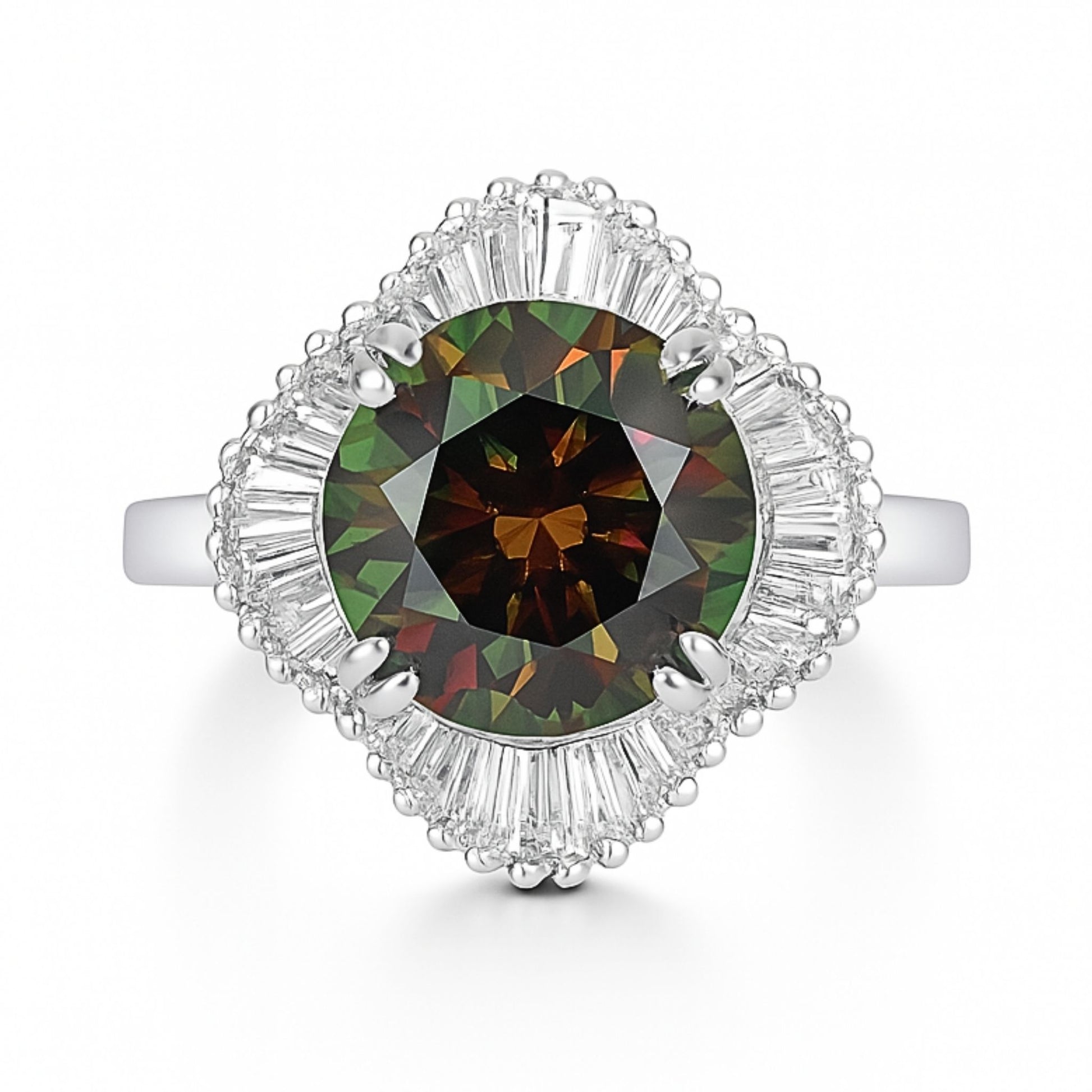 14K 3.65cttw Round Color Change Sphene 0.67cttw Tapered Baguette White Diamond Ring
