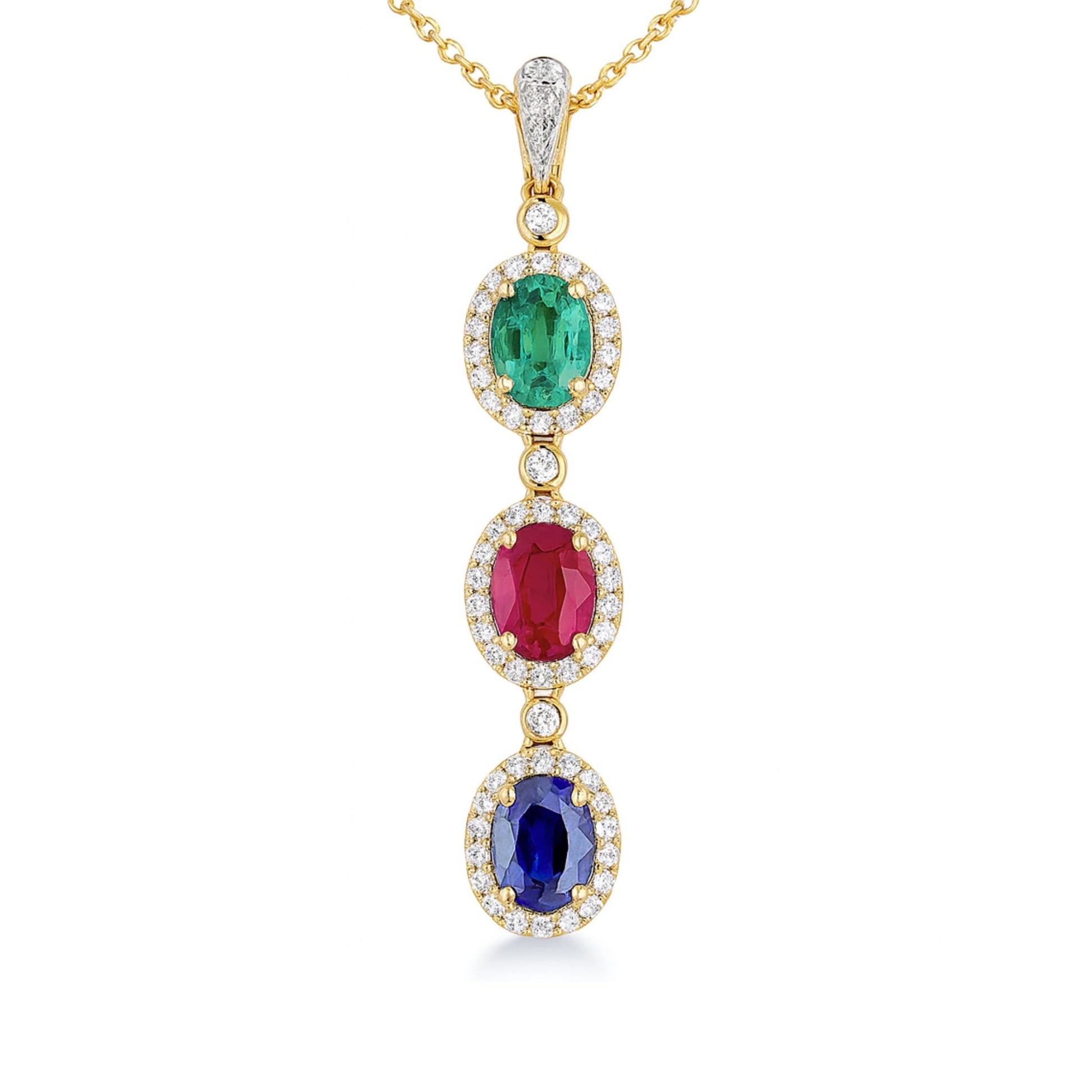 14K 2.78cttw Oval Burma Ruby, Colombian Emerald, and Blue Sapphire 0.48cttw VS White Diamond Pendant