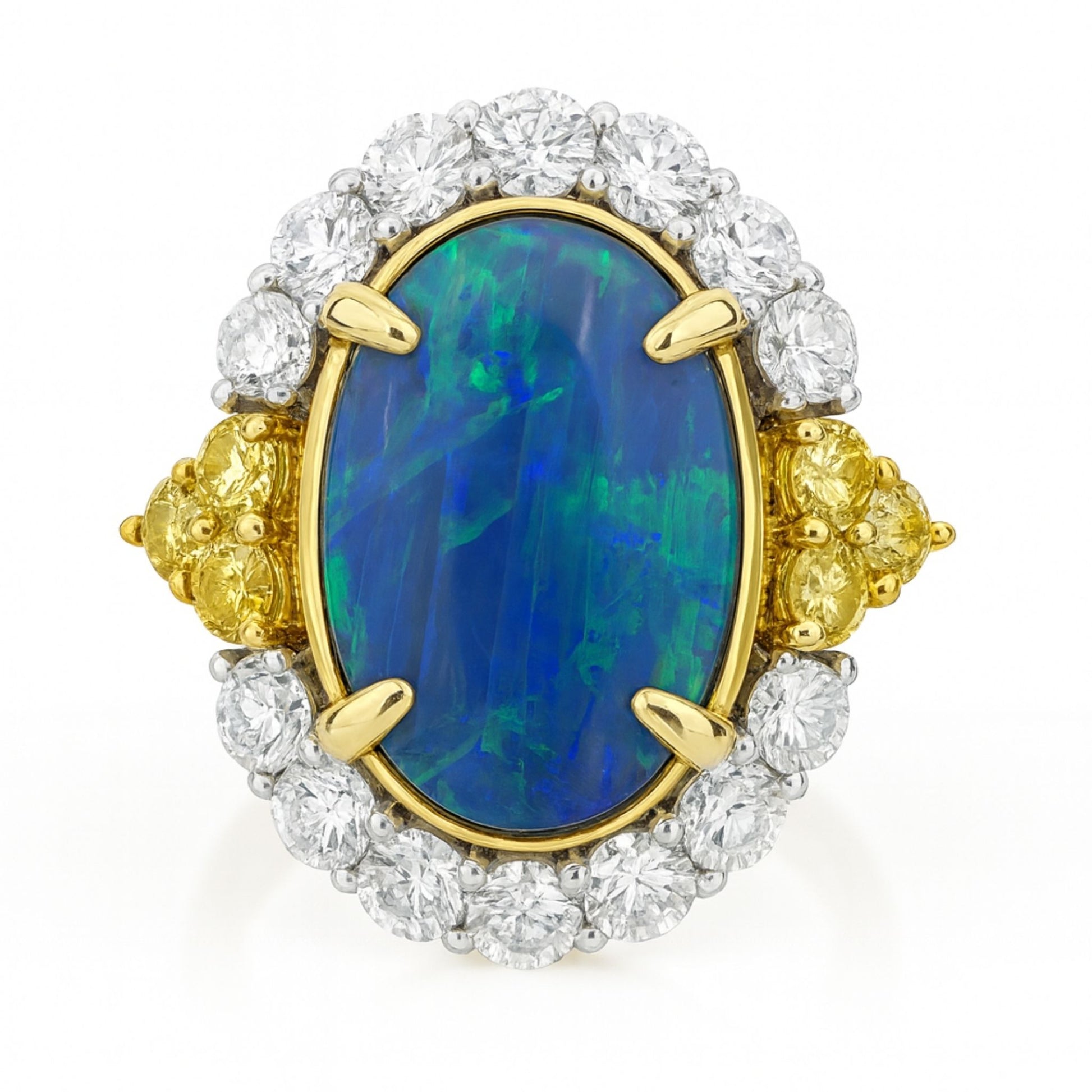 18K 4.05ct Oval Black Opal 1.44cttw VS Yellow & White Diamonds Ring