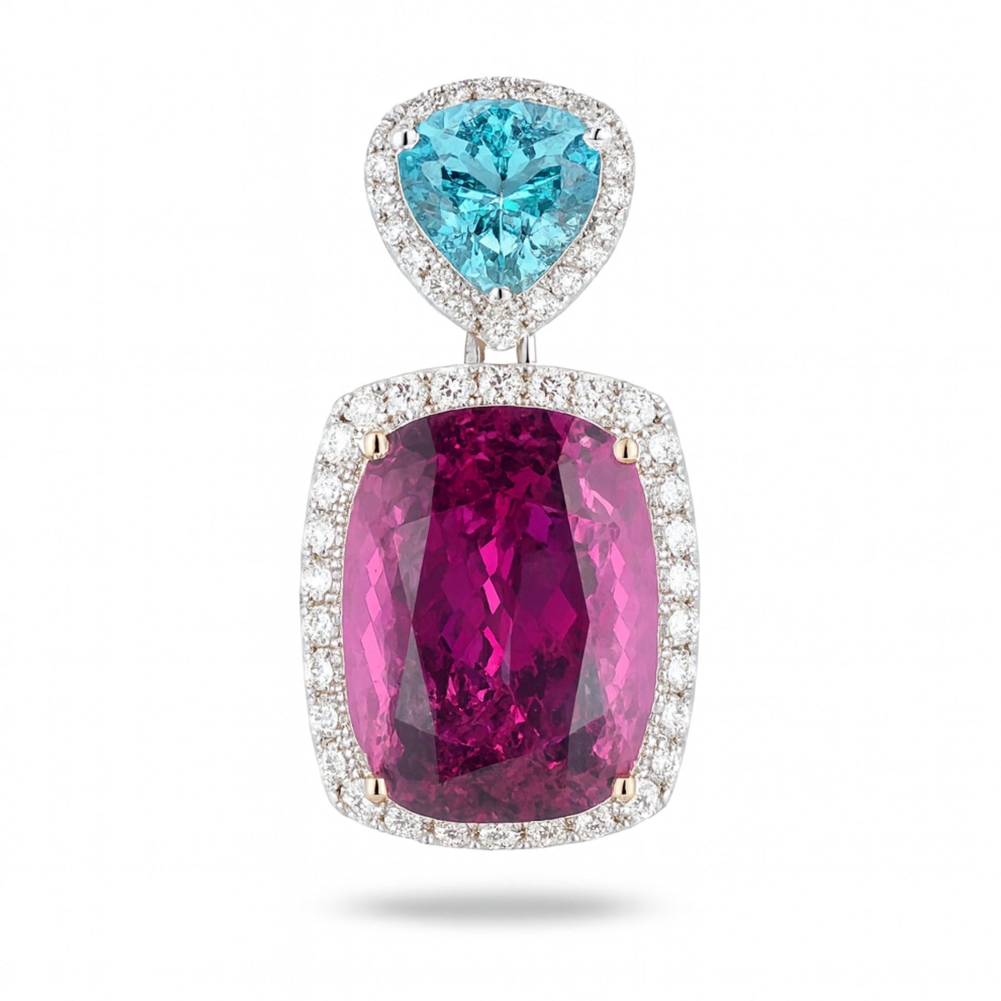 18K 21.80ct Cushion Copper Bearing Tourmaline 2.07ct Pear Shape Paraiba 1.03cttw VS White Diamonds Pendant