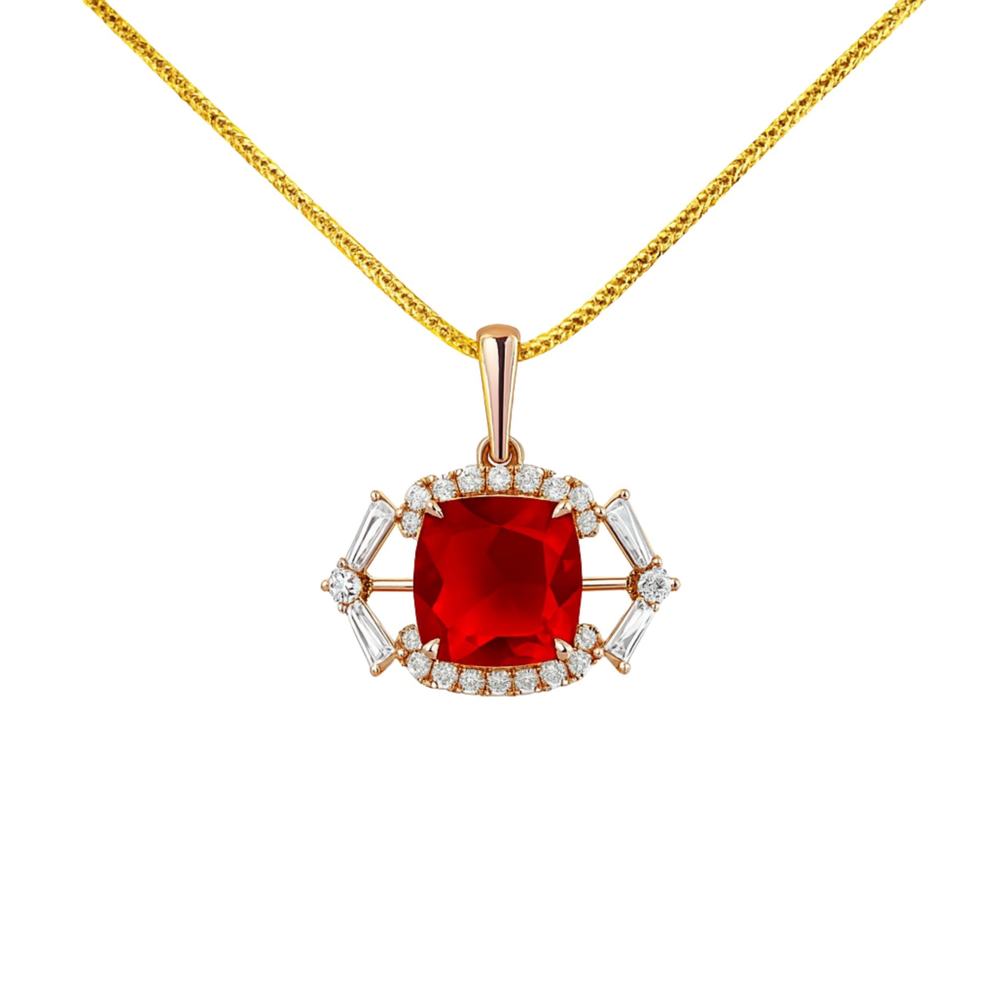 18K 1.02ct Cushion Fire Opal 0.13cttw Round and Tapered Baguette White Diamonds Necklace