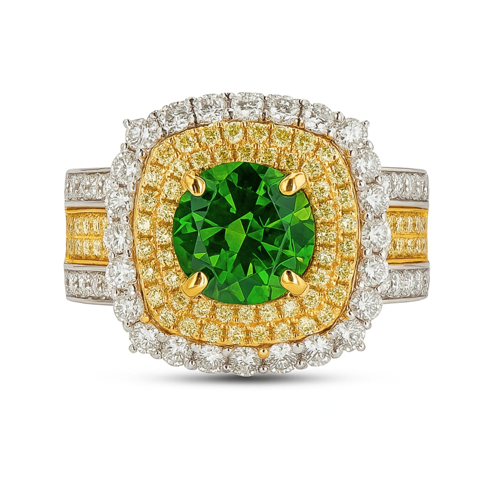 18K 1.97ct Round Russian Demantoid 1.47cttw VS Yellow & White Diamonds Ring
