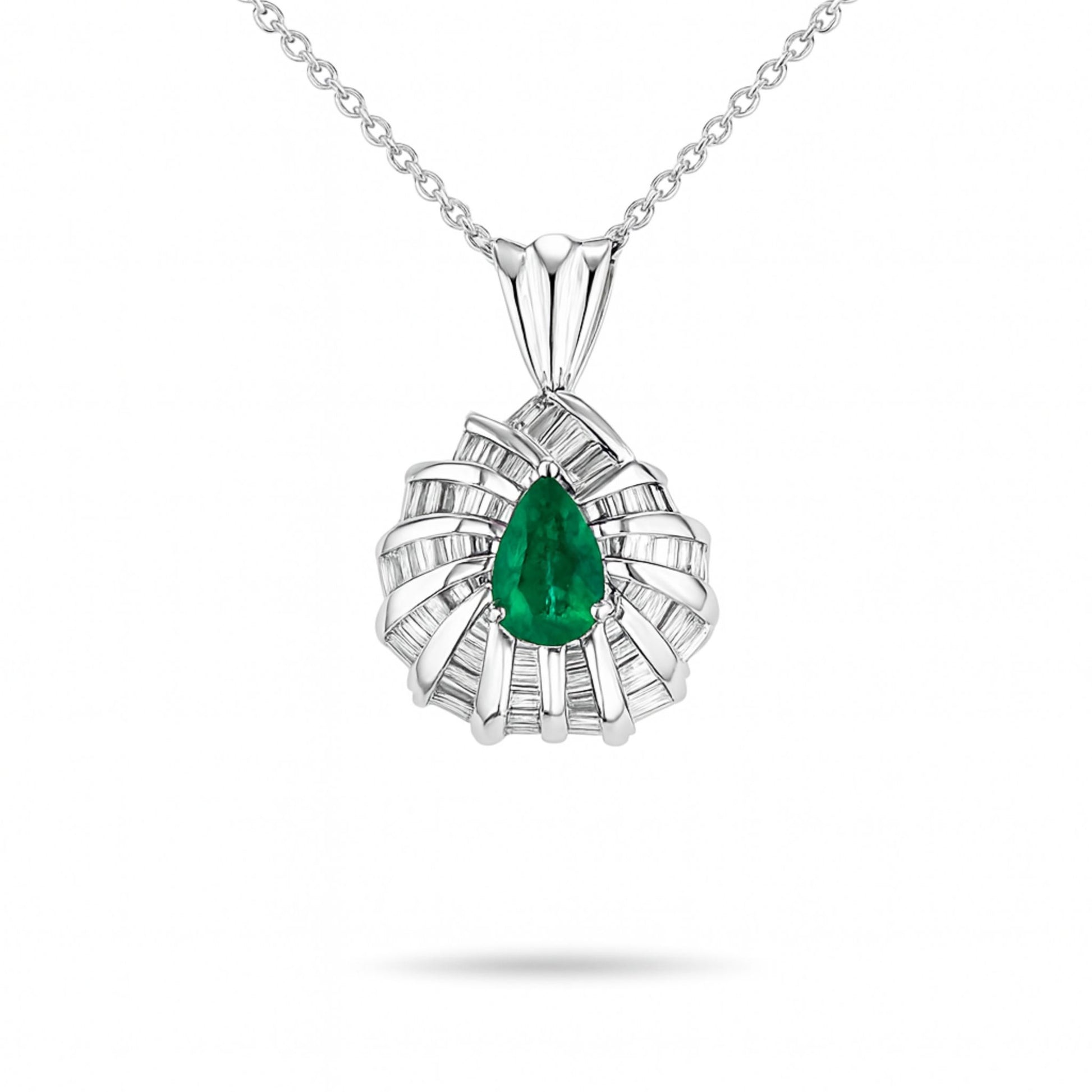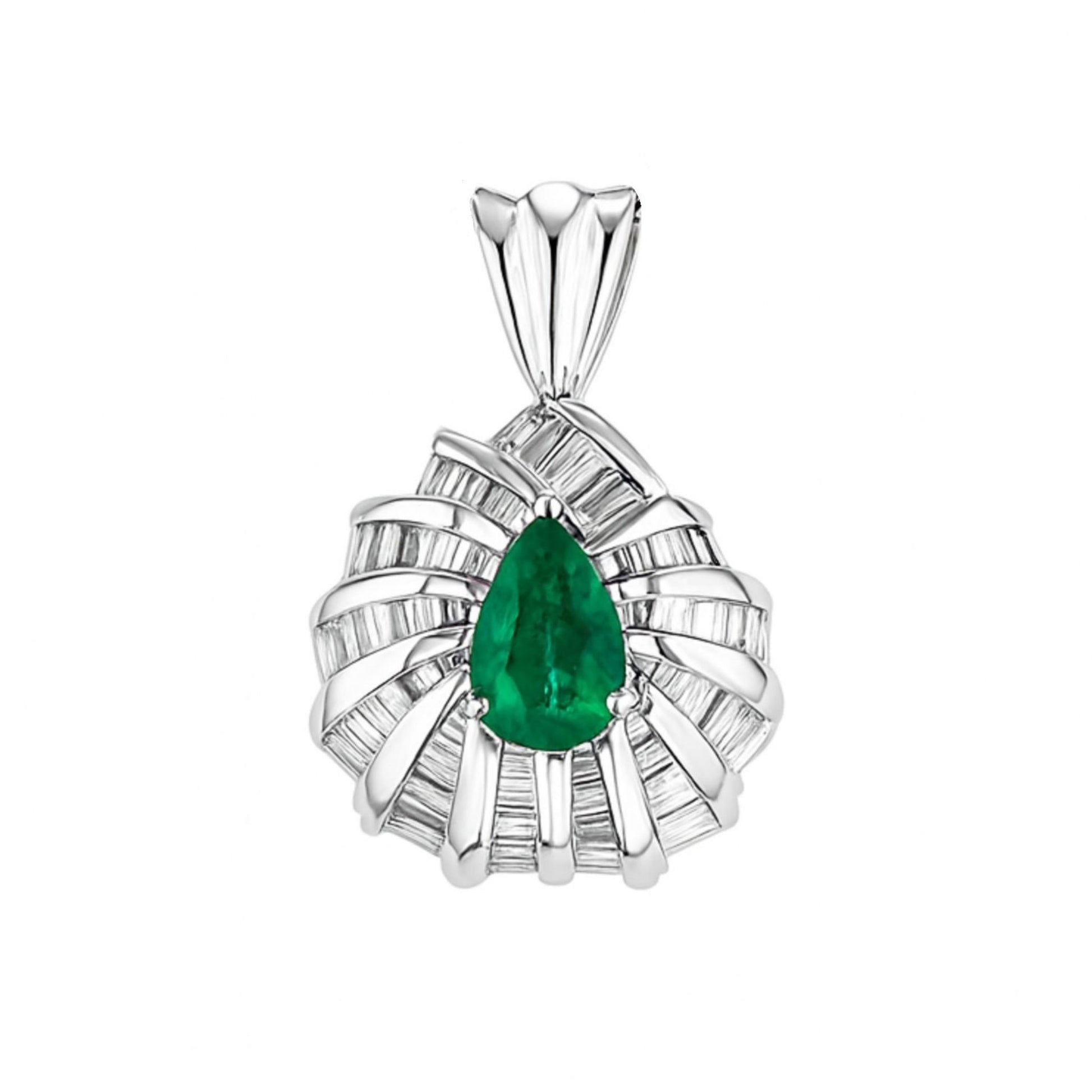 Platinum 0.72ct Pear Shape Colombian Emerald 1.01cttw Tapered Baguette White Diamond Pendant