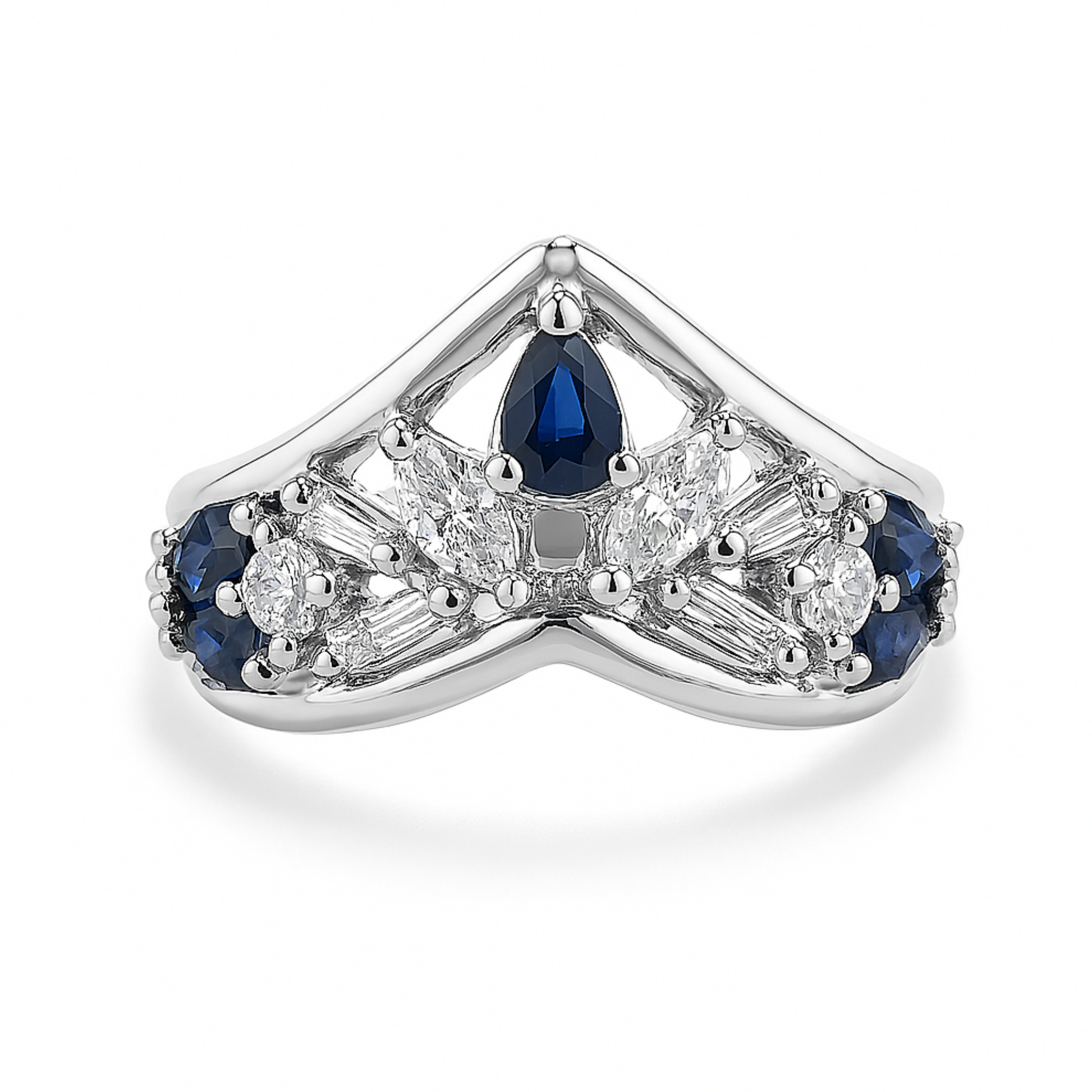 Platinum 0.60cttw Pear & Marquise Blue Sapphire 0.55cttw Round and Tapered Baguette White Diamonds Designer Ring