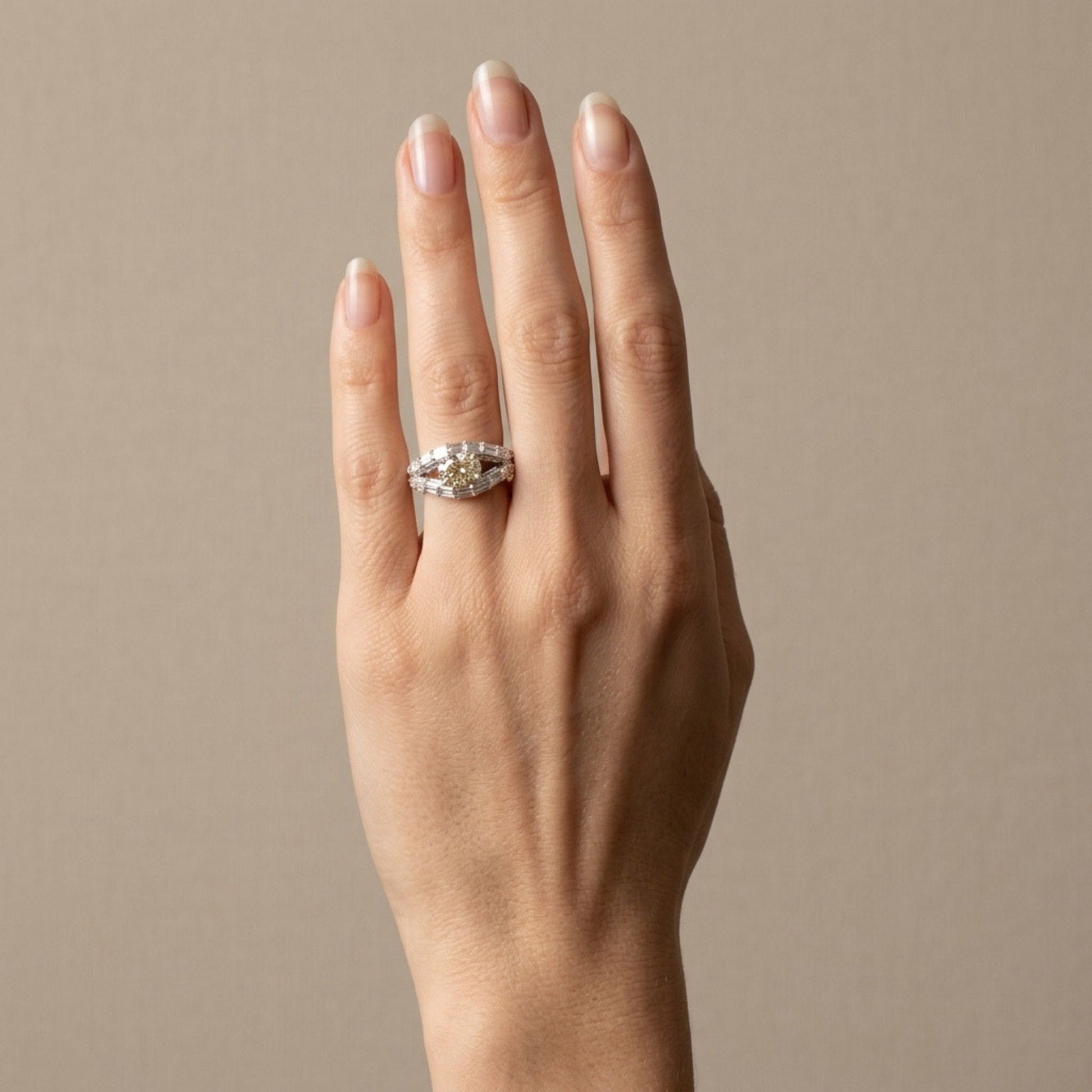 Platinum 1.01ct Oval Yellow Diamond 1.28cttw Baguette White Diamond Ring